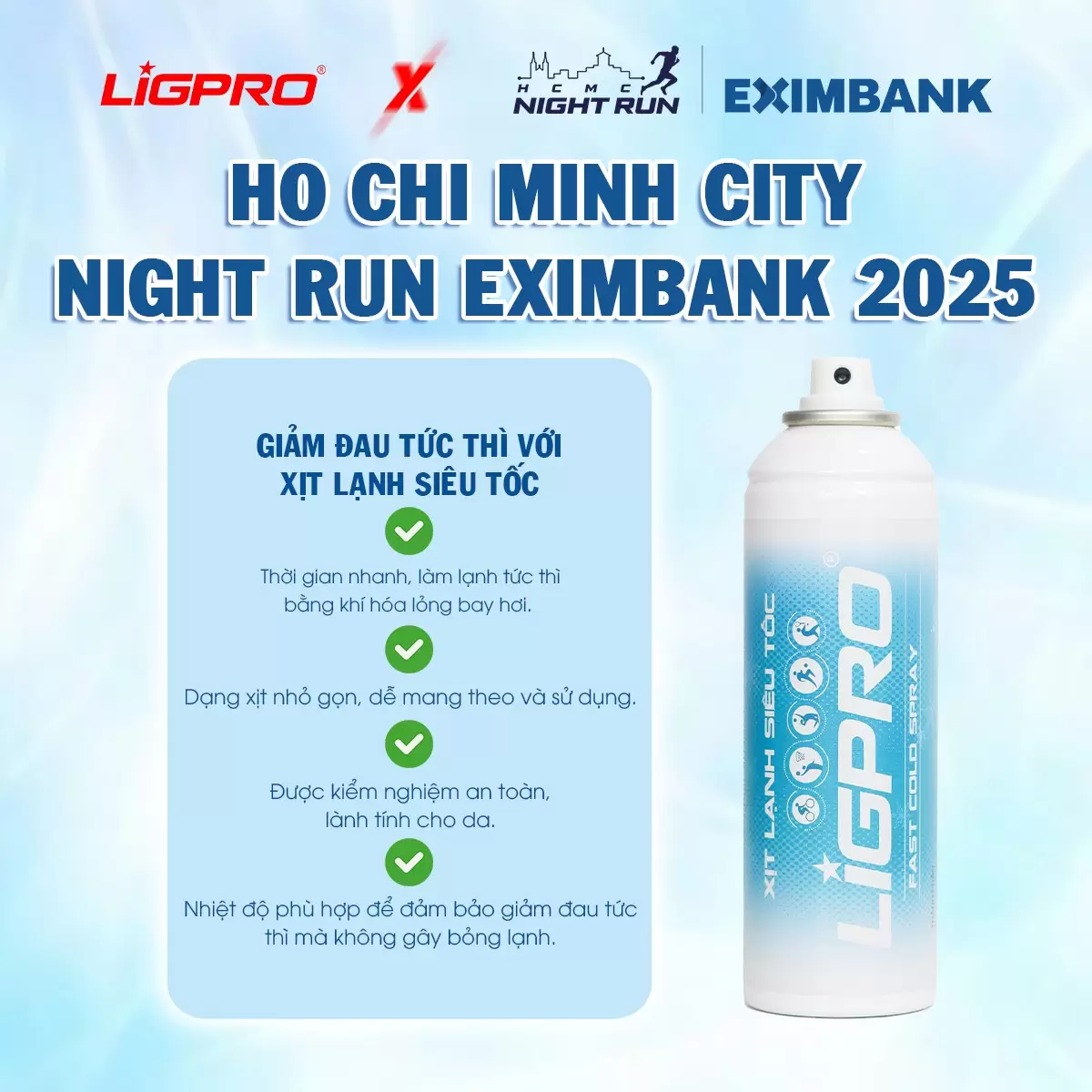Tại Giải chạy đêm TP.HCM Eximbank 2025, Ligpro giới thiệu Xịt Lạnh Siêu Tốc Giảm Đau Tức Thì Ligpro – sản phẩm chủ lực hỗ trợ trong và sau vận động. Với công dụng: