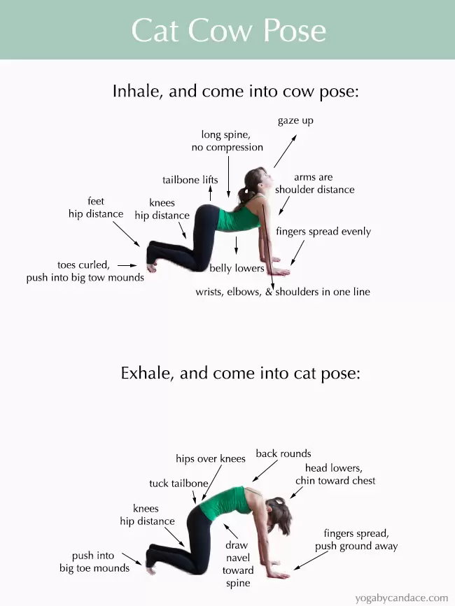 Quỳ trên sàn, tay chống xuống, cổ tay dưới vai, đầu gối dưới hông. Hít vào, cong lưng xuống, ngửa đầu (tư thế bò). Thở ra, cong lưng lên, cúi đầu (tư thế mèo). Lặp 8 lần, di chuyển chậm. Bài tập làm mềm cột sống, giảm căng thẳng lưng dưới.