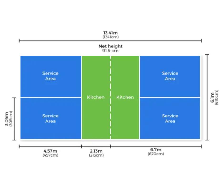 • Sân pickleball: Có kích thước 20 feet x 44 feet (6,1m x 13,4m), tương đương sân cầu lông đôi. Lưới pickleball có chiều cao 36 inch (91,44 cm) ở hai bên cột lưới và 34 inch (86,4 cm) ở giữa.